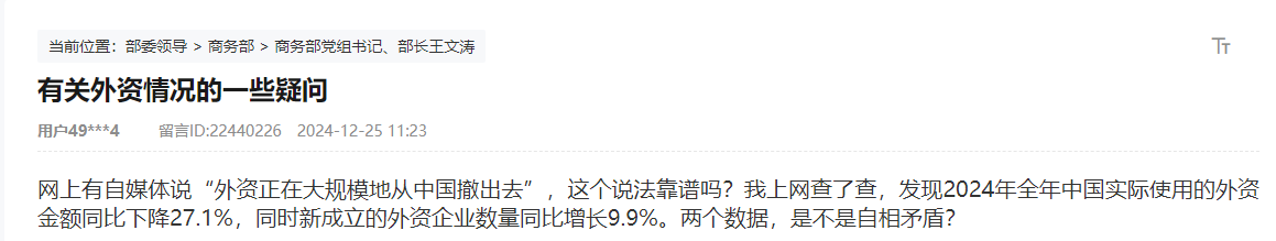 網上有自媒體說“外資正在大規模地從中國撤出去”,這個說法靠譜嗎?我上網查了查,發現2024年全年,中國實際使用的外資金額同比下降27.1%,同時新成立的外資企業數量同比增長9.9%。兩個數據,是不是自相矛盾?