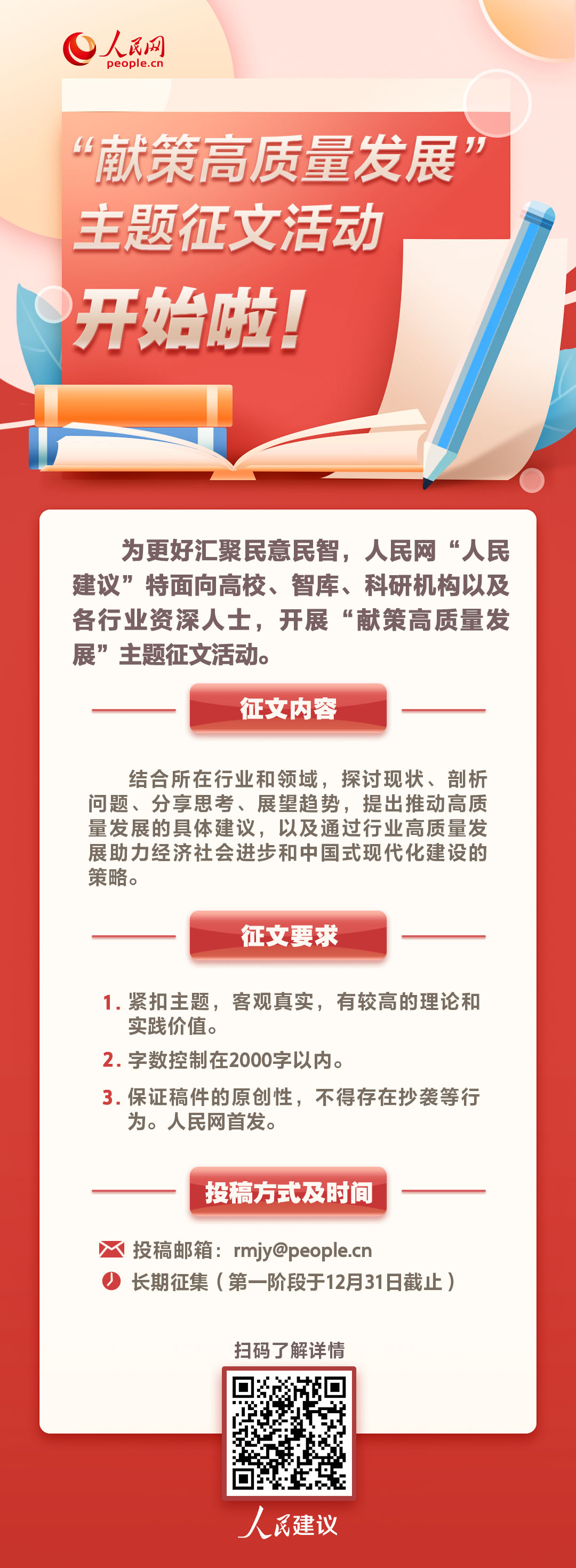 為更好匯聚民意民智,人民網“人民建議”開展了“獻策高質量發展”主題征文活動,邀請專家學者和各領域資深業內人士,為推動經濟社會高質量發展、不斷實現人民群眾對美好生活的向往建言獻策。